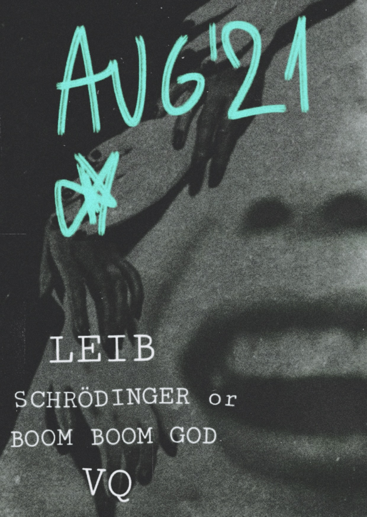 Die Musiker*innen der drei Formationen VQ, LEIB und SCHRÖDINGER or BOOM BOOM GOD haben sich zusammengetan, um eine Tour durch vier Schweizer Städte zu organisieren. Das kulturelle Vakuum der letzen 1 1/2 Jahre soll mit experimenteller & kantiger Musik gefüllt werden: